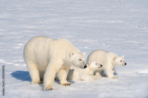 Norway, Svalbard. Polar bear mother and cubs on pack ice in Arctic Ocean.
