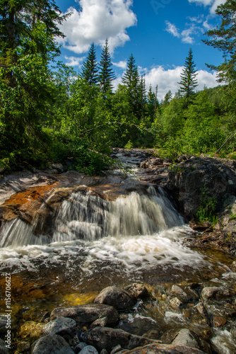 Norwegian mountain river with fast flowing clear and sparkling water and a waterfall that forms white foam on rocks surrounded by green coniferous trees. Sunny summer day.