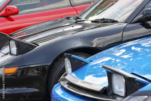 Nostalgic collection of blue, black, and red vintage sports cars parked in row. Close up on shiny automotive bodies and classic pop up headlight design from nineties