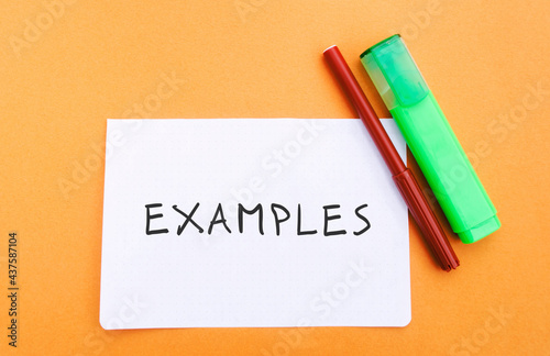 Note with the word Examples and markers. Example, instance, sample. Business, marketing and training concept. Flat lay