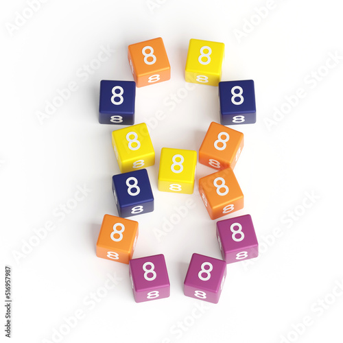Number 8 from cubes. Font from cubes. 3D illustration. White background. Lettering design element. Children's font for learning the alphabet.
