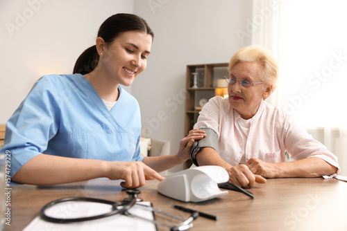 Nurse measuring patient's blood pressure at wooden table indoors. Home health care service
