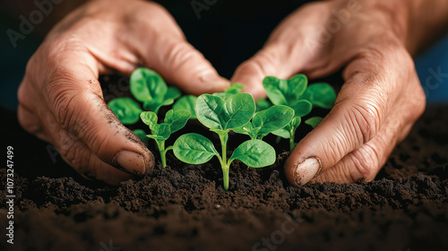 Nurturing hands gently cradle vibrant green seedlings in rich soil, symbolizing growth and care for nature