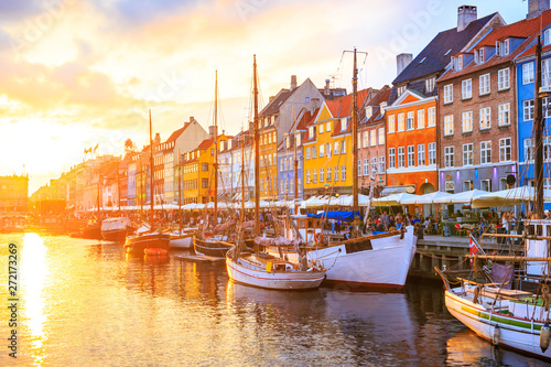 Nyhavn canal in Copenhagen, Denmark - row of colorful houses under sunset colors in the sky.