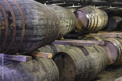 Oak barrels in a whiskey distillery