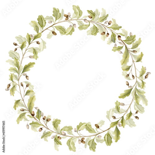 Oak branch Wreath. Hand drawn watercolor illustration of round Frame with acorns and green leaves on white isolated background. Circular border with forest foliage for icon, logo or greeting cards.