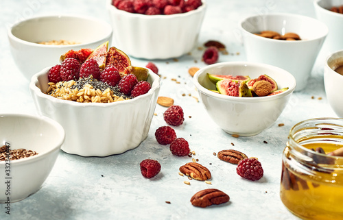 oatmeal with raspberries, figs, chia seeds and nuts for breakfast