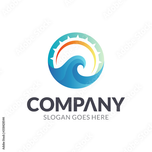 Ocean Wave Logo, Sea and Sunrise Vector Logo