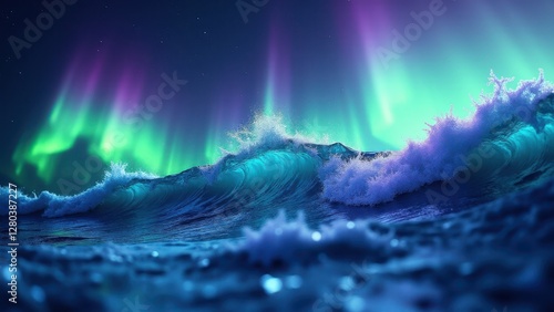 Ocean waves crashing under a vibrant aurora borealis in the night sky.