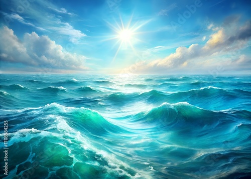 Ocean waves under a bright sun and cloudy sky, a scene of natural beauty