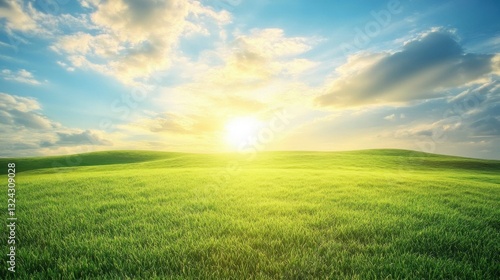 Of a Rolling green hills under a vast sky with soft golden sunlight creating a dreamy atmosphere