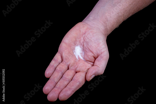 Offene Hand auf der weißes Salz liegt