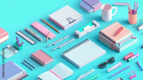 Office desk with various office supplies on a colorful surface.