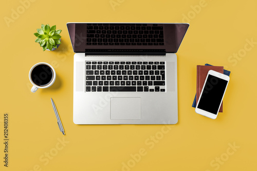 Office desktop with laptop and accessories.