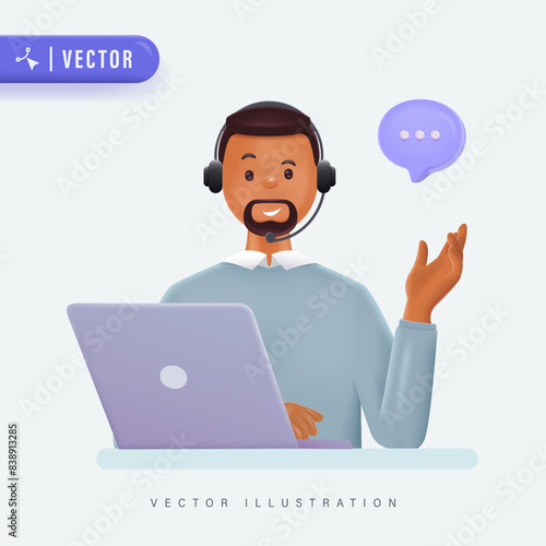 Office operator with headset talking with clients. Customer service, call center, hotline, customer support department staff concept. 3d vector people character illustration. Cartoon minimal style.