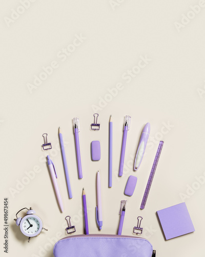 Office supplies very peri trend color, pencils, pens, paper clips, erasers fly from pencil case. School stationery flat lay on table. Back to school pattern on beige background. Copy space