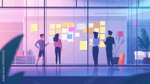 Office, teamwork and business people with sticky notes for brainstorming, planning and solution ideas. Glass wall, collaboration and employees with writing for problem solving, schedule and startup