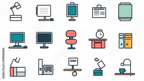 Office thin line icon set. such as office chair, desk, computer, printer, telephone, filing cabinet, notepad, clipboard