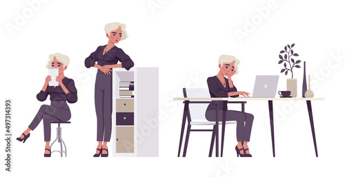 Office worker set, young businesswoman, female employee doing office work. Busy blonde smart girl in formal wear. Vector flat style cartoon character isolated on white background, different poses