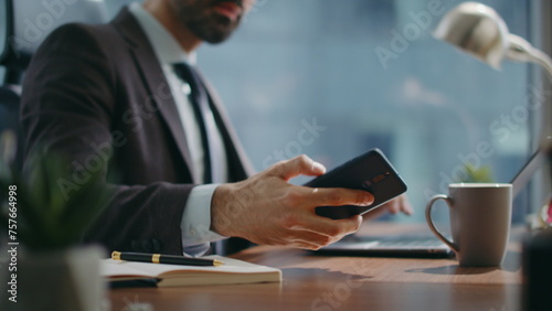 Office worker typing laptop computer on desk looking smartphone screen close up.