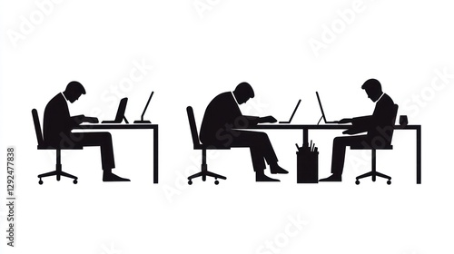 Office workers at desks, focused on laptops, simple silhouette illustration, suitable for educational or business use