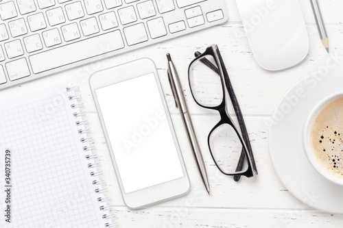 Office workplace with computer, notepad and smartphone