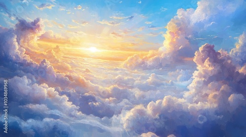 Oil painting depicting a stunning panoramic view of a beautiful sky above the clouds seen from an airplane