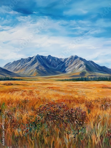 Oil painting depicting a tundra landscape with a distant mountain range under summer skies showcasing the natural beauty of a subpolar region