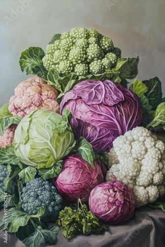 Oil painting depicting an assortment of cabbages including romanesco broccoli and cauliflower showcasing diverse vegetable varieties