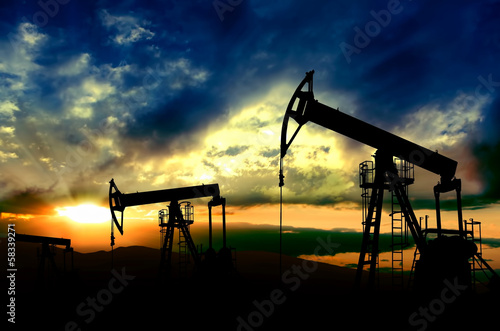 Oil pumps working on sunset background
