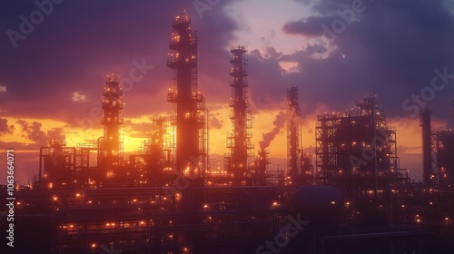 Oil refinery plant at sunset, glowing lights, massive industrial complex.