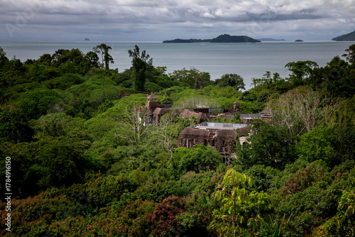 Old abandoned hotel in the jungle. Shabby walls. Beautiful abandoned hotel.