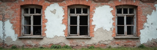Old brick building exterior shows weathered facade with three damaged empty window frames. Plaster peels away revealing aged red bricks, indicating decay and neglect. Green grass grows at base.