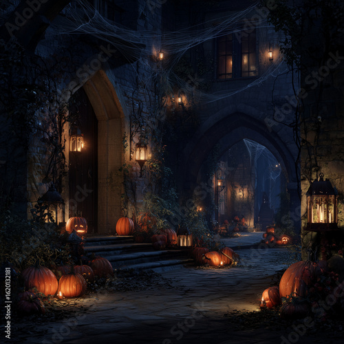 Old castle, pumpkins, lanterns and candles