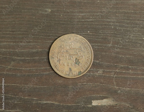 Old copper Indian coin on wooden table