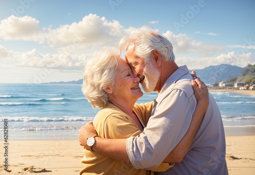 Old couple hugging and love each other with beach coast background