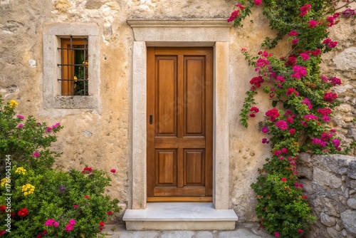 Old Greek door in retro style, set within a weathered stone wall, adorned with vibrant flower plants
