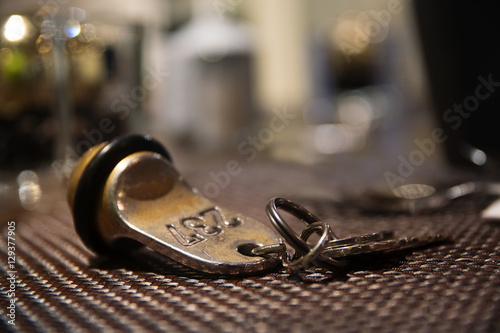 Old hotel room key from brass with the number 237, blurred backgound