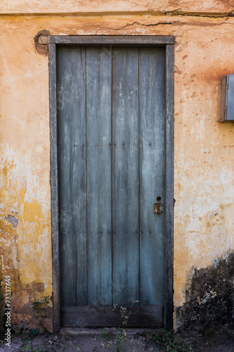 old house yellow wall with blue door