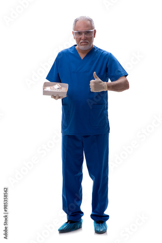 Old male doctor suggesting pills isolated on white