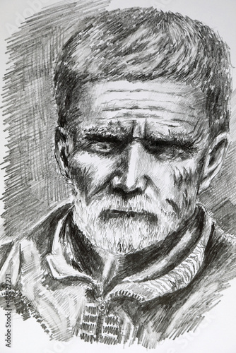 Old man with a mustache - illustration. Detailed drawing of an old sad man with a mustache and beard, drawn in pencil.