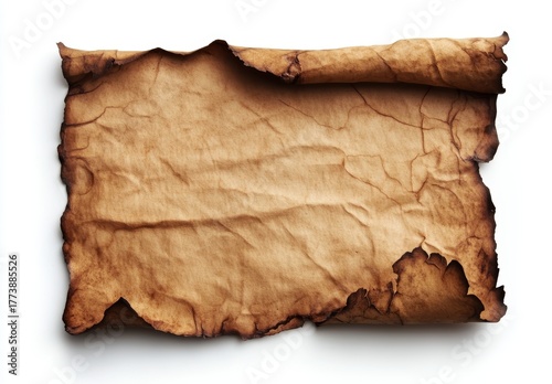 Old Parchment Scroll with Burned Edges, Ancient Paper Texture on White Background, Vintage Letter Design, Map Document Template.