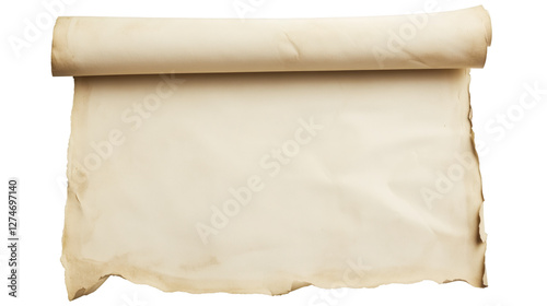 Old, partially rolled scroll displaying damage and blank spaces, set against a transparent background in a horizontal format