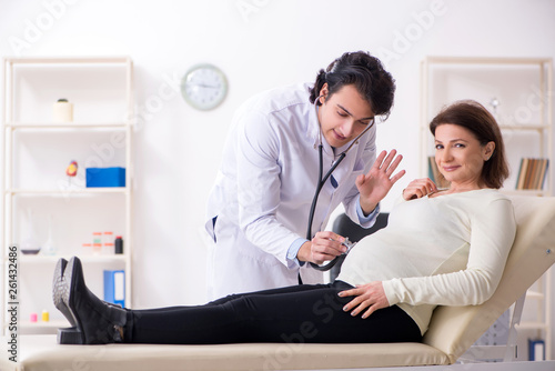 Old pregnant woman visiting young male doctor