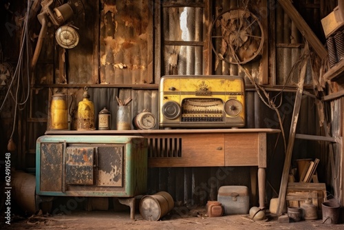 old radio in rustic barn setting, created with generative ai