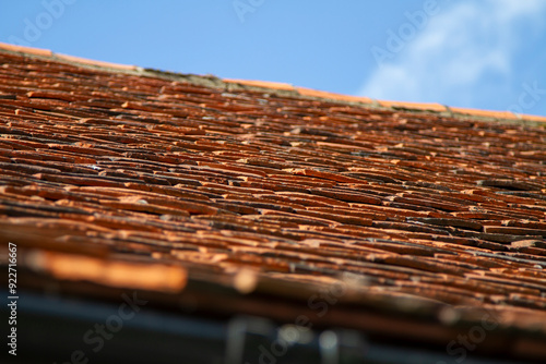 Old traditional roof of an English cottage features orange slate tiles arranged in a distinctive pattern. The weathered tiles add character and warmth, enhancing the cottage's timeless charm.