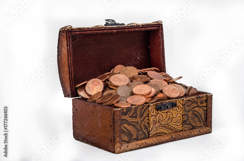 Old vintage retro chest with euro coins isolated on white background