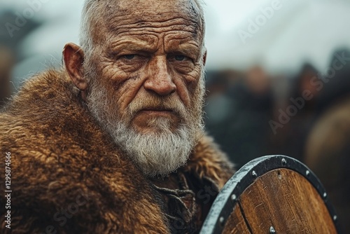 Old warrior preparing for battle in a historical reenactment event during an overcast day