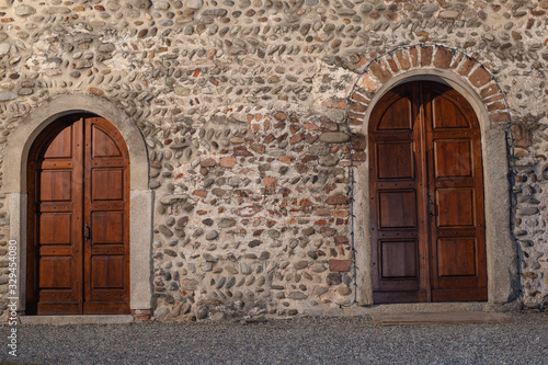 old wooden doors in stone wall, Romanesque style