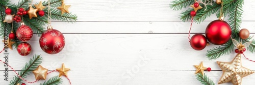 Old wooden frame with various Christmas items arranged around a central star on a rustic background, ornaments, festive, decorations